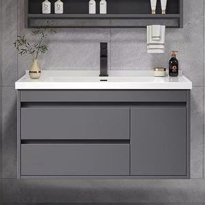 アップグレードされた[タオルバー]ダークグレーの普通のミラーキャビネットスタイルウォールキャビネット-90cm+セラミック洗面器+ハードウェアアクセサリー[取り付け込み]-