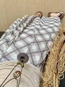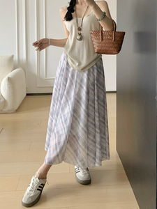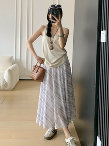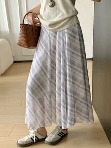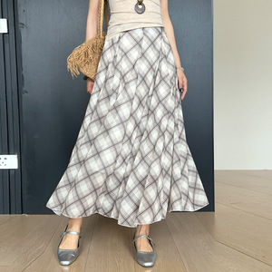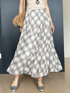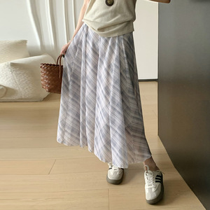 韓国レトロ万能チェック柄スカートレディース夏痩身ハイウエストルーズミドル丈Aラインビッグスカートロングスカート