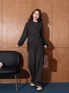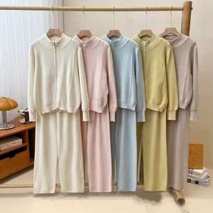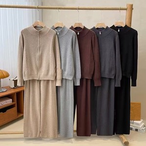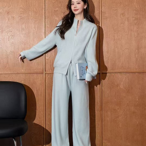 跨境女装新款针织两件套秋冬时尚休闲双拉链开衫上衣+阔腿裤套装