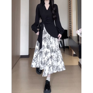 设计感不规则拼接水墨碎花连衣裙女秋季小个子假两件收腰领长裙