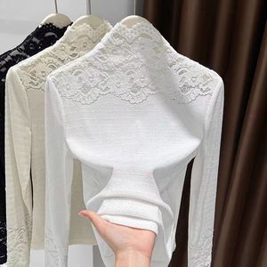 2025早秋季新款气质蕾丝拼接半高领长袖针织恤女内搭打底衫上衣