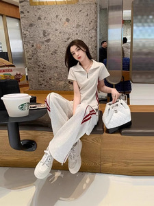 女性のためのファッショナブルなスーツ夏の新しい韓国スタイルの西洋スタイルの年齢を減らすポロカラートップカジュアルスポーツワイドレッグパンツ 2 点セット