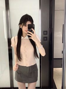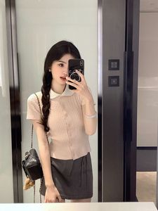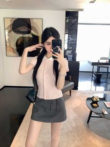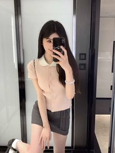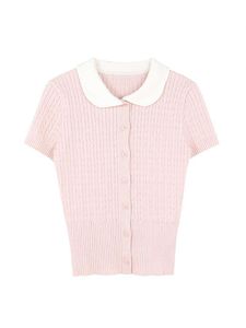 ピンクの気質ポロカラーニット半袖レディース2025新作夏スリムフィットスイートショートトップ