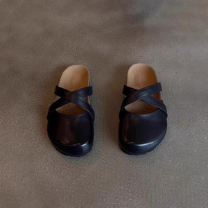 シープスキンバージョン~レトロクロスストラップ厚底つま先ハーフスリッパアウター春夏新作本革スリッポンビルケンシュトックシューズ