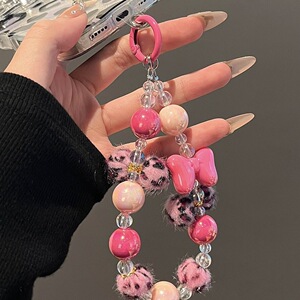 ヒョウ柄インファーボールリボンビーズショートチェーン携帯電話ケースストラップccdカメラキーホルダーリストペンダント