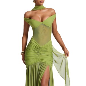 欧美女装夏季新款一字肩网纱拼接开衩飘带连衣裙