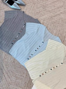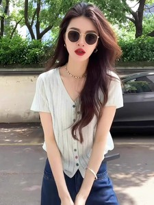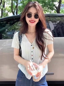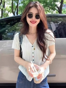 v领针织短袖T恤女夏季穿搭薄款冰丝设计感蓝色独特漂亮减龄款上衣