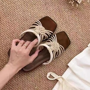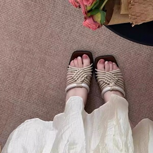 羊柄バージョン~夏新作アウターチャンキーヒールホリデーカジュアルサンダル手織りオープントゥワンストラップスリッパ女性用