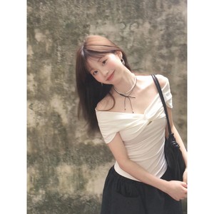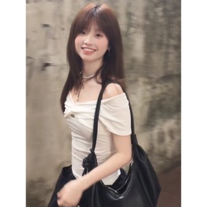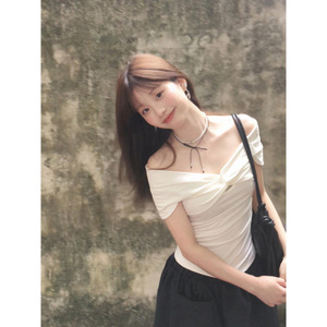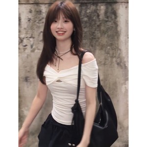 フレンチスタイルの優しいスタイルのツイストワンショルダーTシャツレディース2025年夏新作オフショルダースリムフィット万能トップ