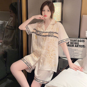 夏のアイスシルクパジャマ女性の新しい韓国スタイルルーズカーディガンラペルシンプルカジュアル半袖ホームウェアセットイン