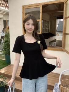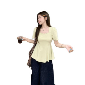 工場直販大きいサイズ Pure Desire スクエアネック右肩半袖 Tシャツレディース 2025 夏新作ファット mm スリムプリーツ裾