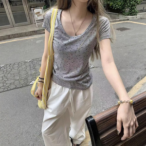 薄款U领波点t恤女夏季新款灰色复古正肩修身显瘦短袖辣妹透感上衣