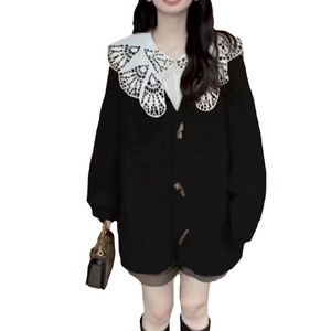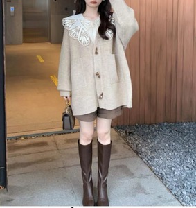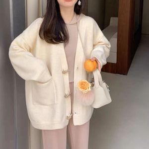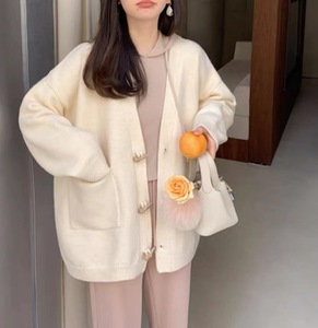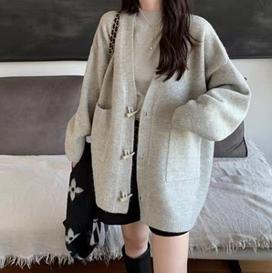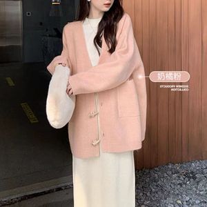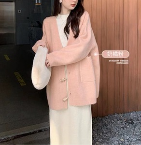 法式奶奶衫粉色奶fufu牛角扣V领设计感中长款毛衣外套针织开衫女