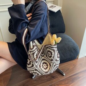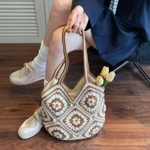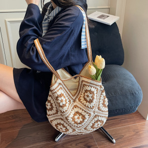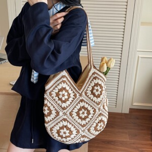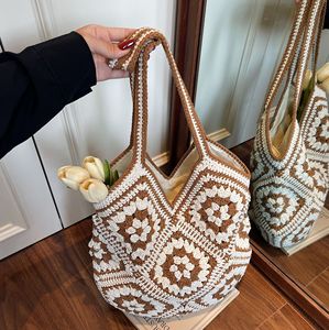2025 新しいリゾートスタイルビーチコントラストカラーニッチデザインレディースバッグシンプルなワンショルダー脇中空綿糸織バッグ