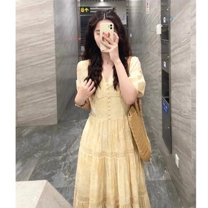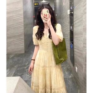 フレンチスタイルの高級イエローVネックドレスレディース夏新作ウエスト痩身ユニークでシックなロングスカート