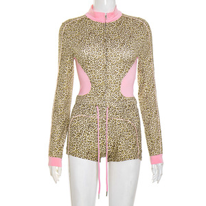 D25ST225 ヨーロッパとアメリカのクロスボーダーレディース春夏コントラストヒョウ柄ジッパーカーディガン長袖巾着スリーポイントスーツ
