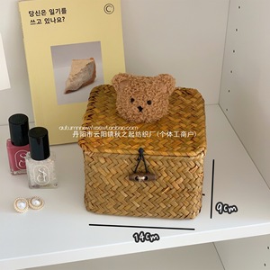 床头柜收纳盒发夹发饰收纳筐可爱小熊装饰香水小样翻盖草编织批发