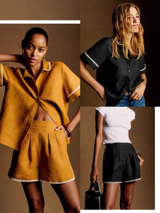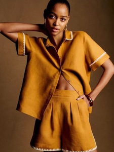 25夏新作ファッションシンプル半袖ラペルフロントボタン刺繍シャツ+リネンハイウエストショーツセット