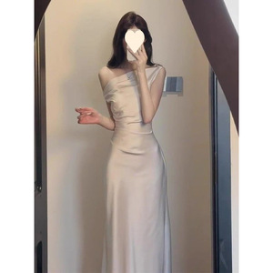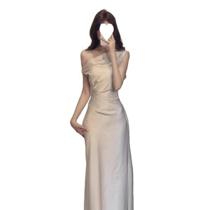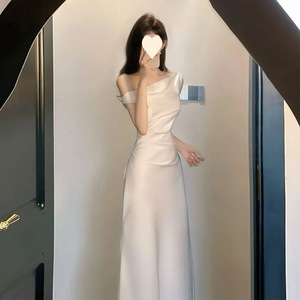 フレンチスタイルのハイエンドスイングカラーシャイニーショルダードレスウエストカバーヒップアセテートサテンバンケットドレス女性の新しいスタイル