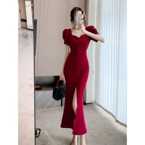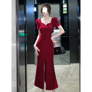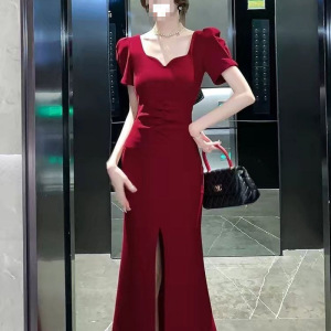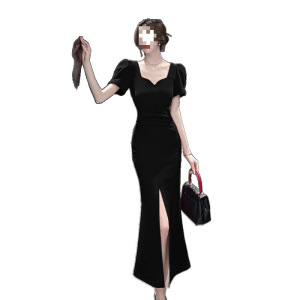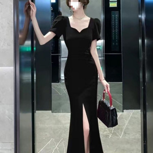 D6C 夏の新しいフレンチスタイルの女性用半袖スクエアネックドレス、ハイエンドのウエスト痩身スリットヒップカバー