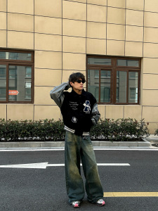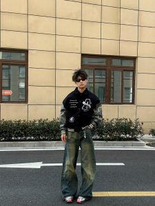 アメリカンレトロ野球ユニフォームジャケットメンズ春新作ラペル刺繍カップルスタンドカラージャケットルーズスプライシングトップ