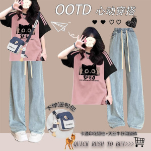 女子学生スーツ 2025 夏新作韓国風海外風半袖 Tシャツ薄手ジーンズ 2 点セット