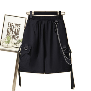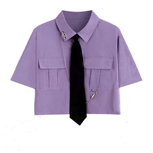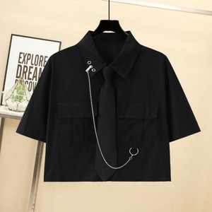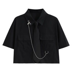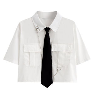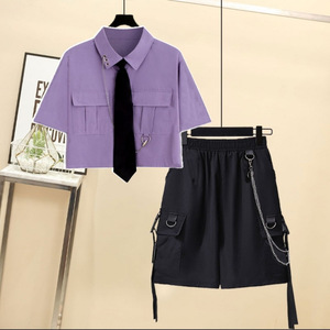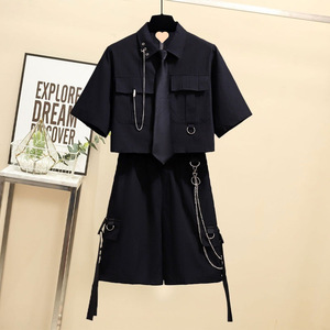 2025夏季套装女学生新款韩版宽松领带短袖衬衫+工装五分裤两件套