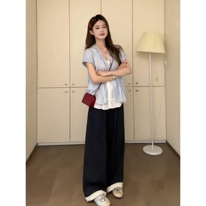 プラスサイズファットmmブルーストライプフェイクツーピース半袖シャツ女性の夏の新しいスタイルのゆったりとした肉をカバーし、スリムな気質のトップ
