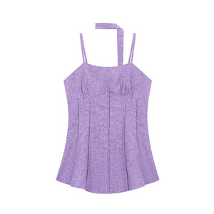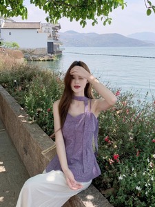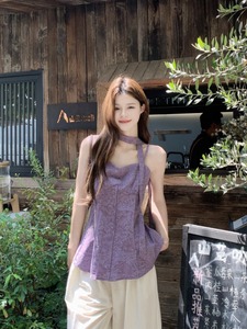 フレンチレトロな気質ジャカードパープルキャミソールレディース夏ニッチシックで美しいリボンショートトップ