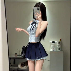 女性用サマーカレッジスタイル衣装セット、タイのホットガールチェック柄ホルターネックベスト、ハイウエストプリーツスカート2点セット