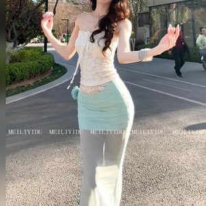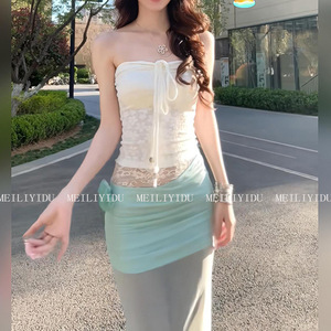 ホワイトジャカードストラップバックビューティーチューブトップ女性の夏の純粋な欲望トップレースステッチメッシュスカートスーツ