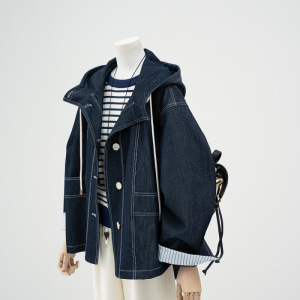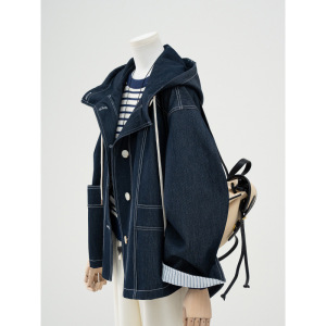 深蓝色休闲设计感条纹拼接外套女2025春新款韩系宽松时尚连帽上衣