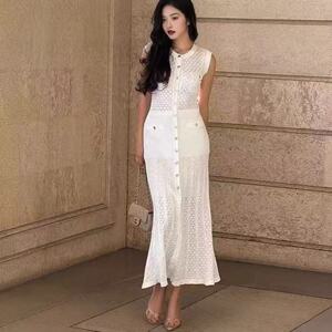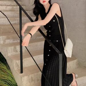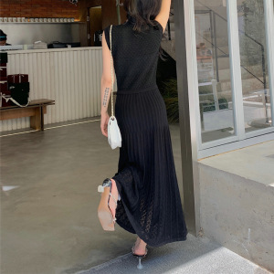 ヨーロッパとアメリカからのクロスボーダーサプライ、フレンチスタイル、エレガントで優しい黒のスリムなノースリーブヒップカバースカート、女性用ニットロングスカートドレス