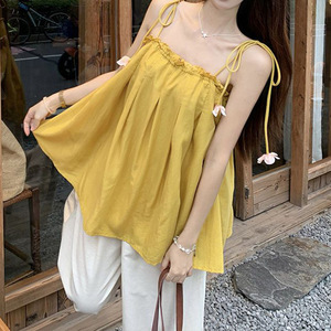 韓国フラワーサスペンダープリーツベスト女性のための 2025 夏の新しいスタイル純粋な欲望スタイル年齢を減らすルーズレースアップアウタートップ