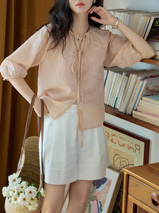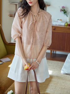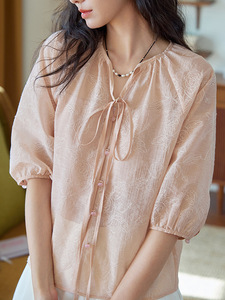ピンクのラウンドネックレースアップラグラン刺繍半袖シャツ女性の夏のフレンチレトロ気質トップ