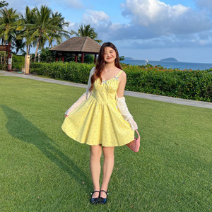プラスサイズ 2025 夏の新作レディースイエローバドスカートコントラストカラーリボンサスペンダードレス