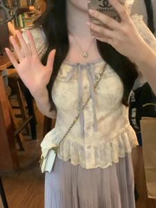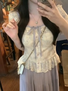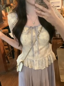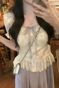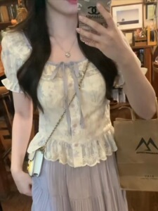 韓国風小花柄スクエアネック半袖Tシャツ女性用夏純粋な欲望スタイルユニークで美しいパフスリーブシャツトップ