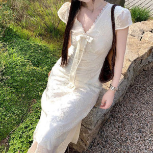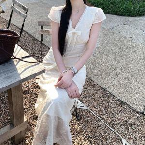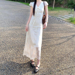 フレンチデザインプリーツVネック半袖ドレスレディース2025年夏新作スリムフィットミドル丈スカート