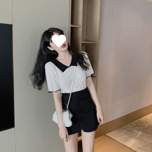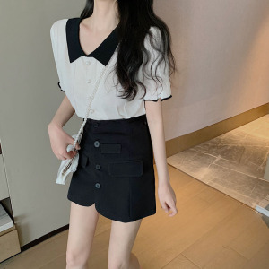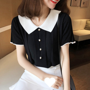 ファッションカレッジスタイルニット半袖薄いベビードールカラートップ白夏の新しい小さなシャツ女性のハイウエスト Tシャツイン