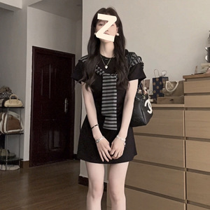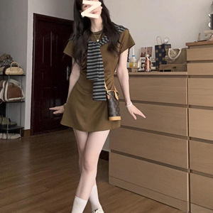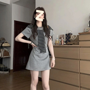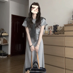 2025 ミニマリストスタイル夏半袖ラウンドネックショールドレスファッショナブルな痩身レトロ韓国スタイルロングスカート女性の純粋な欲望スタイル