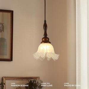 中世スタイルのレストランシャンデリア 3 ヘッドロングプレートゴム無垢材バーペンダントラインレトロ寝室ベッドサイドスズランフラワーランプ