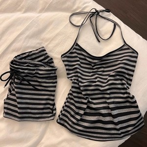 纯欲条纹系带挂脖小吊带睡衣女夏季辣妹带胸垫美背短裤家居服套装