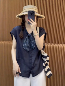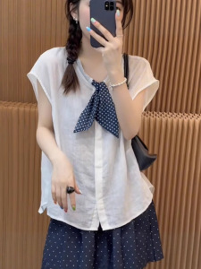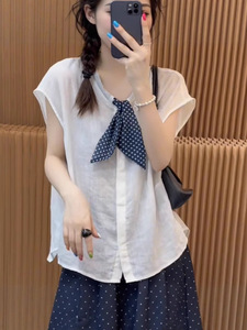 ヨーロッパステーション 2025 夏の新ファッション V ネックシルクスカーフ綿とリネンシャツ女性の韓国スタイルカバーショルダースリーブプリーツシャツ