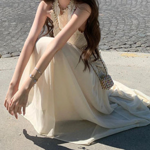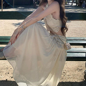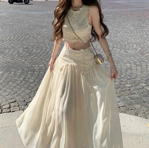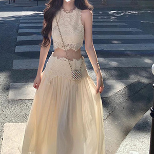 高級ピュアディザイアホットガールレースノースリーブベストトップスリムフィットスプライシングロングスカート2点セット