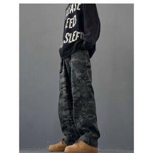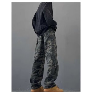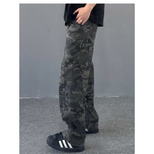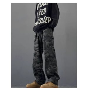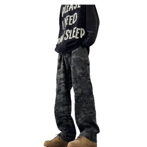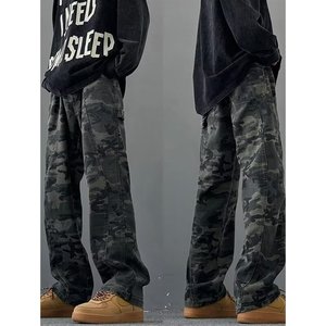 アメリカン迷彩オーバーオールメンズハイストリートバイブレトロファッションストレートルーズビッグポケットデザインデニムロングパンツ