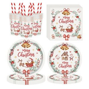 新しいサンタクロースの小さな鐘をテーマにしたパーティー使い捨て紙皿、ティッシュ、紙コップ、ストロー装飾用品セット