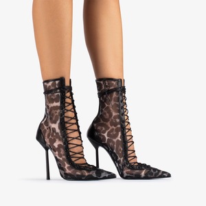 外贸新款夏季欧美风豹纹网纱漆皮拼接前系带后拉链细跟高跟凉靴女