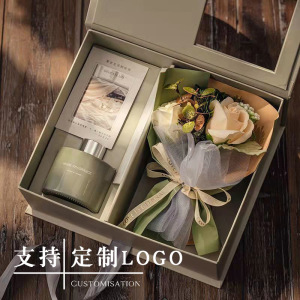 香薰花束橄榄绿礼盒+栀子花+手提袋+灯+贺卡