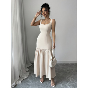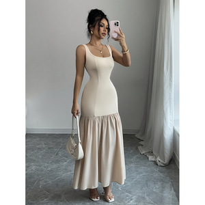 スポット外国貿易アマゾン独立ステーション夏の女性のスクエアネックノースリーブプリーツウエストスリムアプリコットステッチエレガントロングスカート