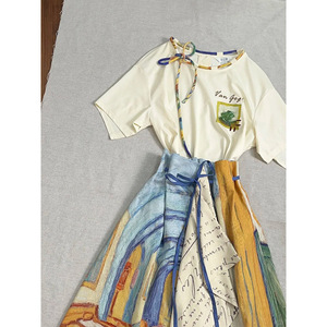 フレンチレトロ文学半袖Tシャツトップス不規則スカートレディース夏ゴッホ油絵風ウェア1